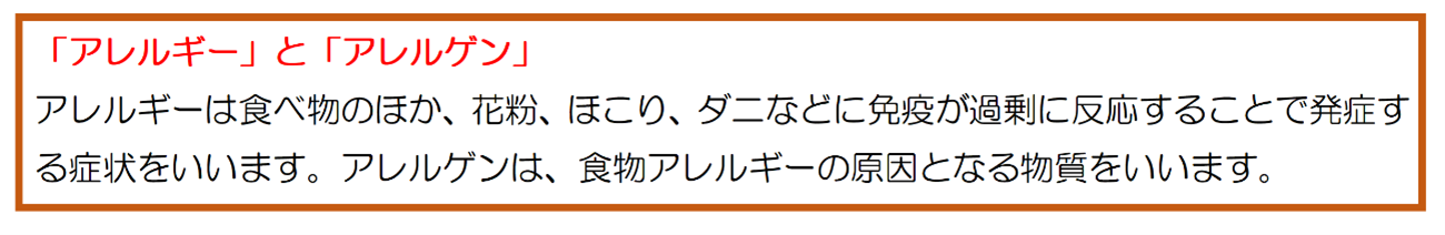 食物アレルギーとは、食物を摂取した際、身体が食物に含まれるたんぱく質等(以下「アレルゲン」という)を異物として認識し、自分の体の過剰に防御することで不利益な症状を起こすことです。主な症状は「かゆみ・じんましん」、「唇の腫れ」、「まぶたの腫れ」、「おう吐、「咳・ぜん息」などです。「意識がなくなる」、「血圧が低下してショック状態になる」(アナフィラキシーショック)などの重篤な症状を呈する場合もあり最悪の場合、死に至ることもあります。