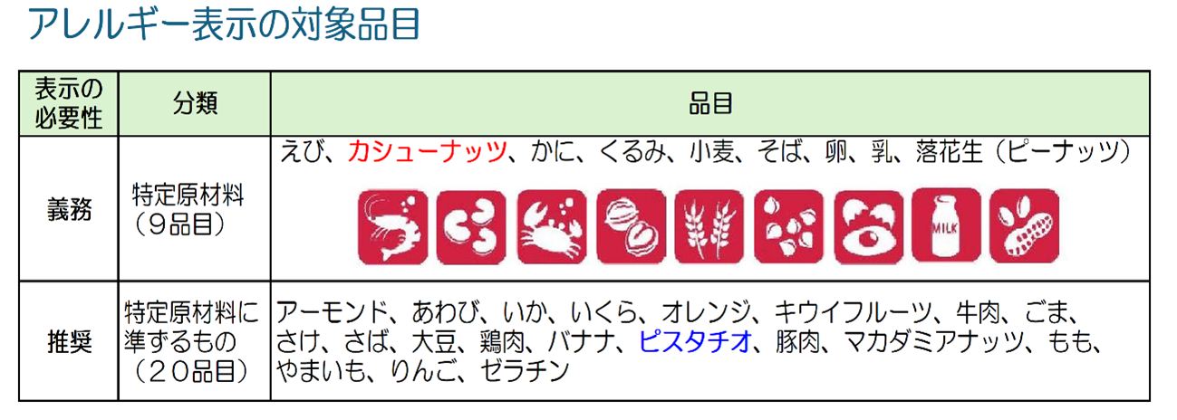 特定原材料の「カシューナッツ」は2年間の経過措置期間があり、2028年4月に施行されます。また、特定原材料に準ずる「ピスタチオ」も同様になります。
