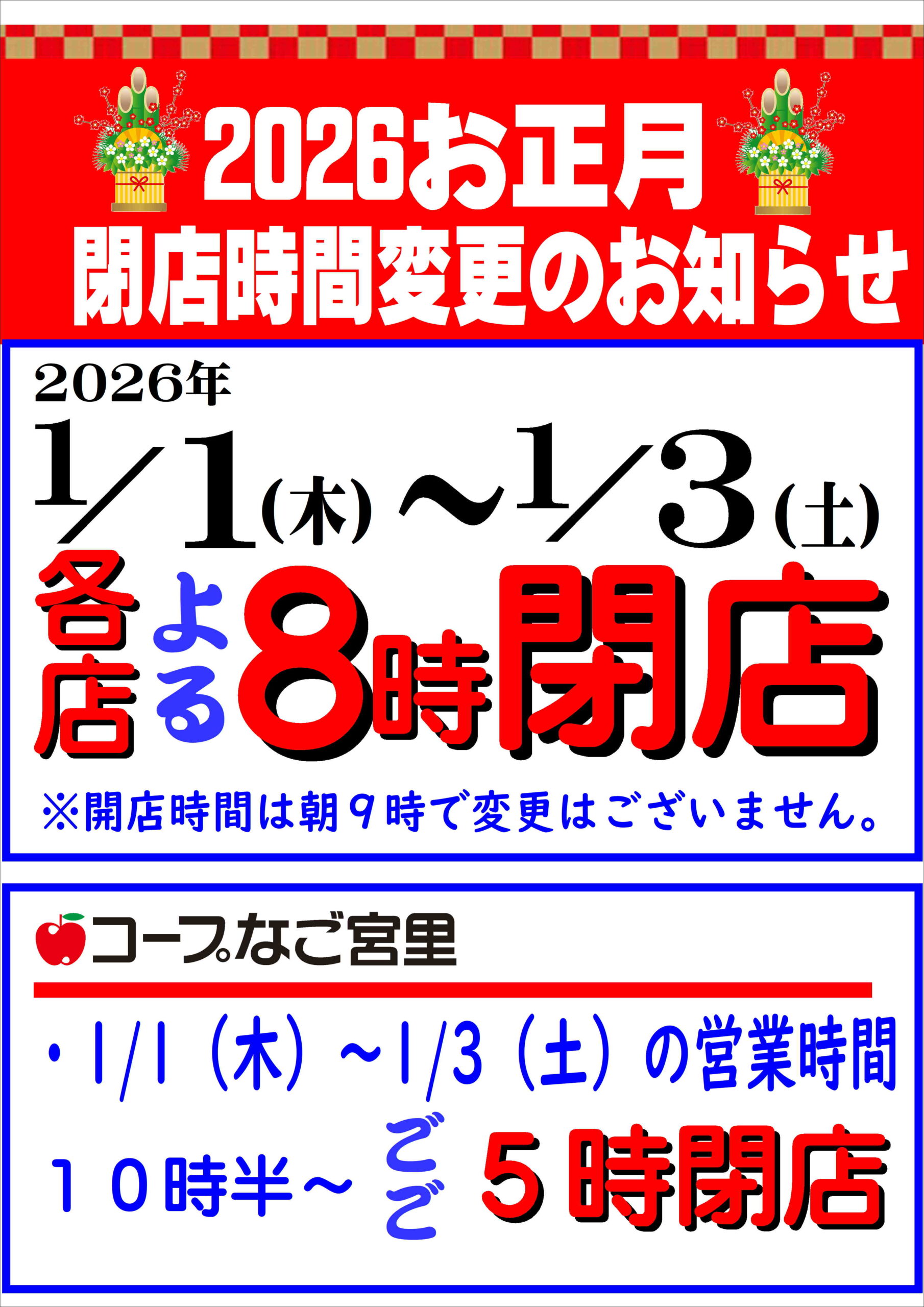 2026年正月三が日(1/1~1/3)コープのお店、営業時間変更のご案内