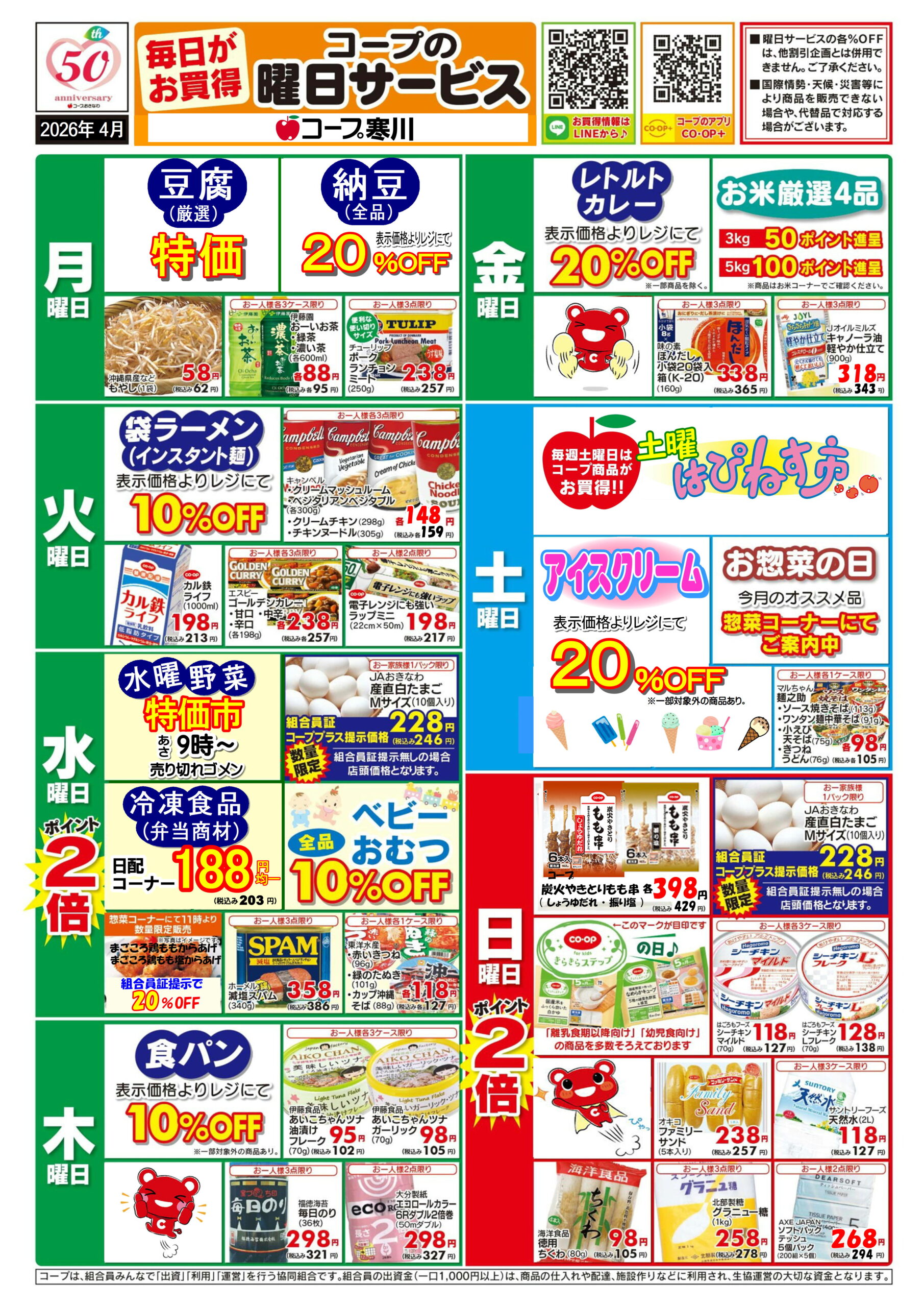 4月 お店【寒川】「お買い得情報」「曜日サービス」